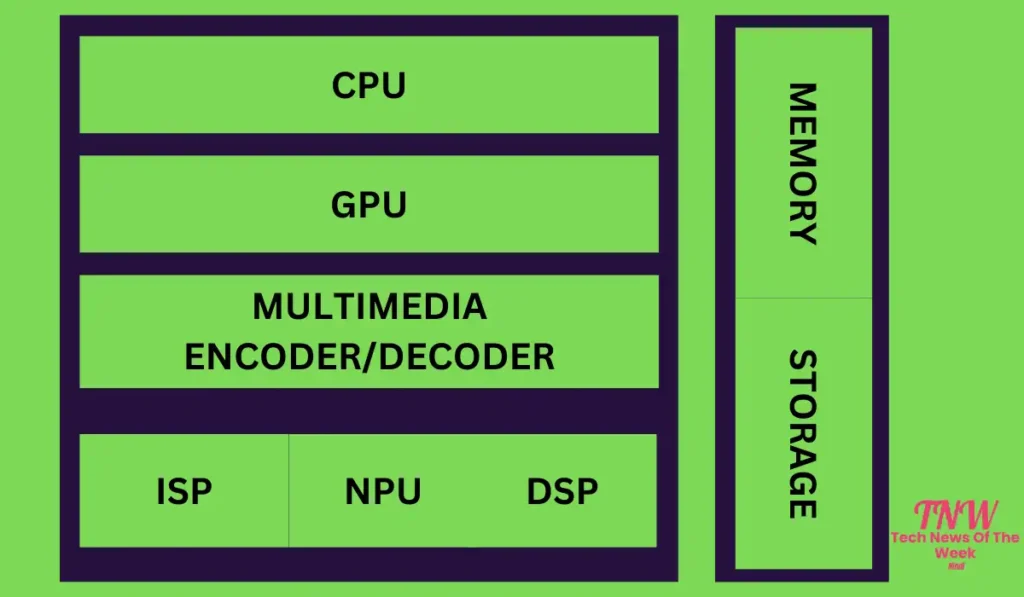 NPU एक विशेष प्रोसेसर (specialized processor) है जो AI परफॉर्मेंस (performance) को बूस्ट (boost) करता है।यह मशीन लर्निंग (machine learning) टास्क्स के लिए एक टर्बो इंजन (turbo engine) की तरह है, जो इन्हें CPU और GPU से हटाकर (offload) तेज और प्रभावी (efficient) बनाता है।जैसे इमेज रिकग्निशन (image recognition), वॉयस असिस्टेंट्स (voice assistants), या स्मार्ट कैमरा (smart cameras) जैसे फीचर्स के लिए यह महत्वपूर्ण भूमिका निभाता है।यह मुख्य प्रोसेसर (main processors) का रिप्लेसमेंट (replacement) नहीं है, बल्कि AI वर्कलोड्स (AI workloads) के लिए एक सहायक(partner) की तरह काम करता है। - Video encoder/decoder: यह वीडियो कन्वर्ज़न (video conversion) को कुशलता (efficiently) से हैंडल (handle) करता है।यह रॉ वीडियो डेटा (raw video data) को एक छोटे और सँभालने लायक फॉर्मेट (manageable format) में कम्प्रेस (compress) करता है और कॉम्प्रेस वीडियो (squished video) को उसकी ओरिजिनल फॉर्म (original form) में अनकम्प्रेस (uncompress) करता है।SoC में मेमोरी (memory) का उपयोग स्टोरेज (storage) के लिए किया जाता है।यह वॉलेटाइल (volatile) या नॉन-वॉलेटाइल (non-volatile) मेमोरी हो सकती है।